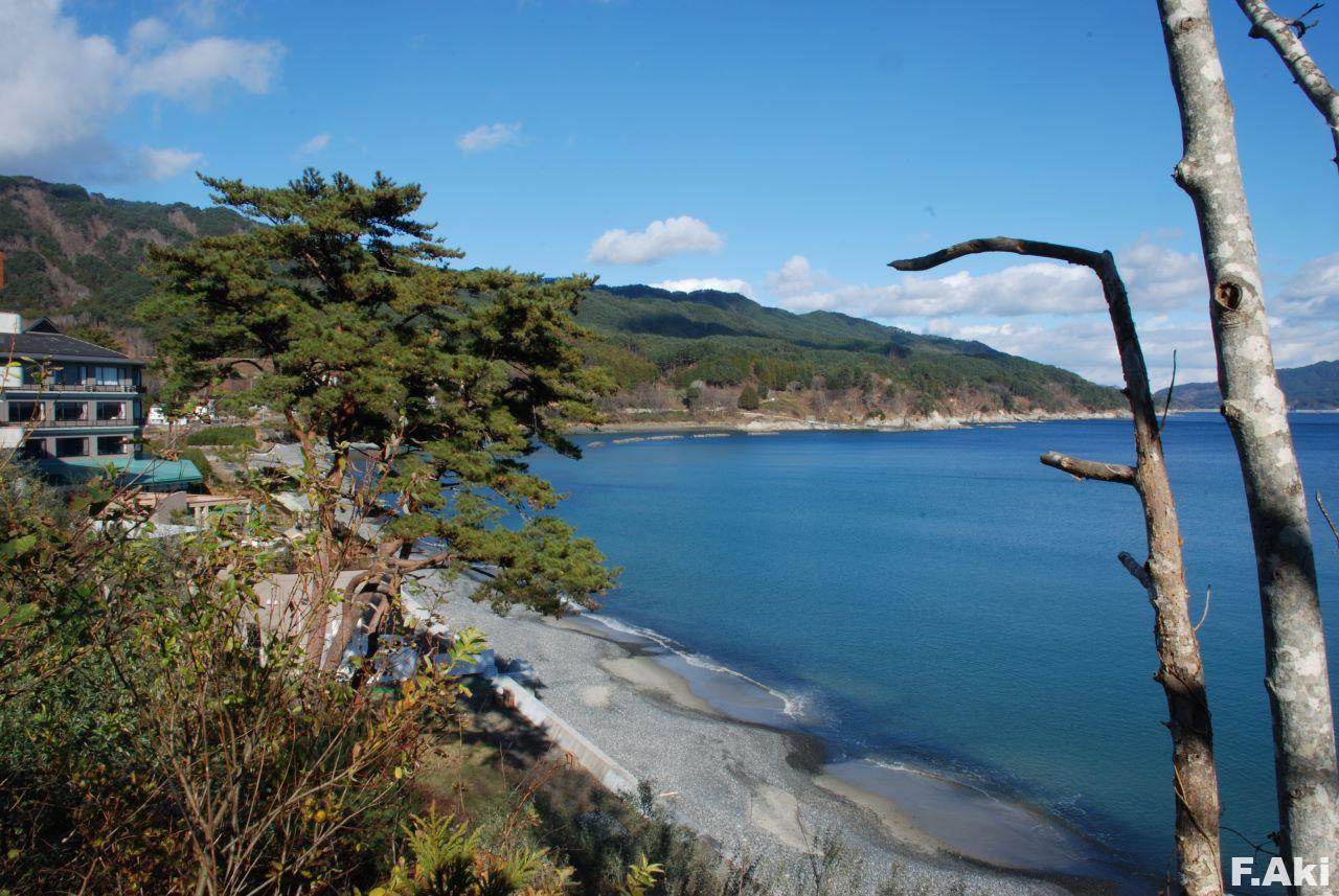 温暖な気候の南三陸に位置するとは言え、2月の最低気温は-6度に達する時もある釜石市。カワサキ Z900RS SE Yellow Ball イエローボール(綽名:Lucky Ball)はバッテリーを外し冬眠中。最近の`ツキノワグマ・熊´は冬眠しない事もあるようだが、バイクは無理せず冬眠させるのが無難。ジムニーで浪板海岸に向かう。自宅から釜石インターチェンジを登り、北上。大槌インターチェンジを降り、国道45号線を6.5㌔ほど北進すると右手に浪板海岸がある。片道23㌔、所要時間25分ほどの手軽なコース。岩手県 上閉伊郡大槌町 吉里吉里(きりきり)第14地割3-1に位置する浪板海岸。アイキャッチ画像は、旅館・はまぎく手前の駐車場から撮影したもの。ここからの景色は右手を樹木に遮られ、残念ながら半島に囲まれた海を一望することができない。さんずろ家という食事処のちょっと先の小さな駐車場から眺めた方が海岸全体を見渡せる。また、吉里吉里湾の一部も視界に収められる。